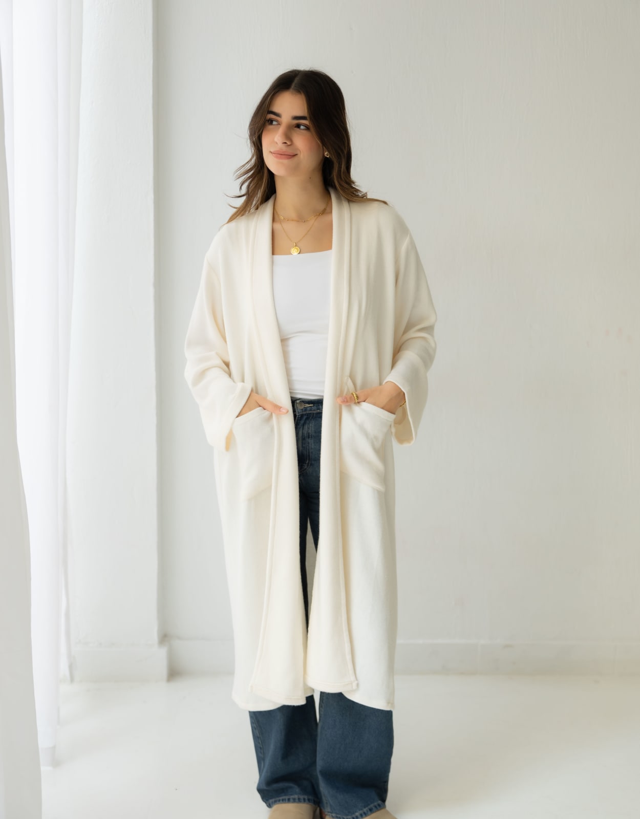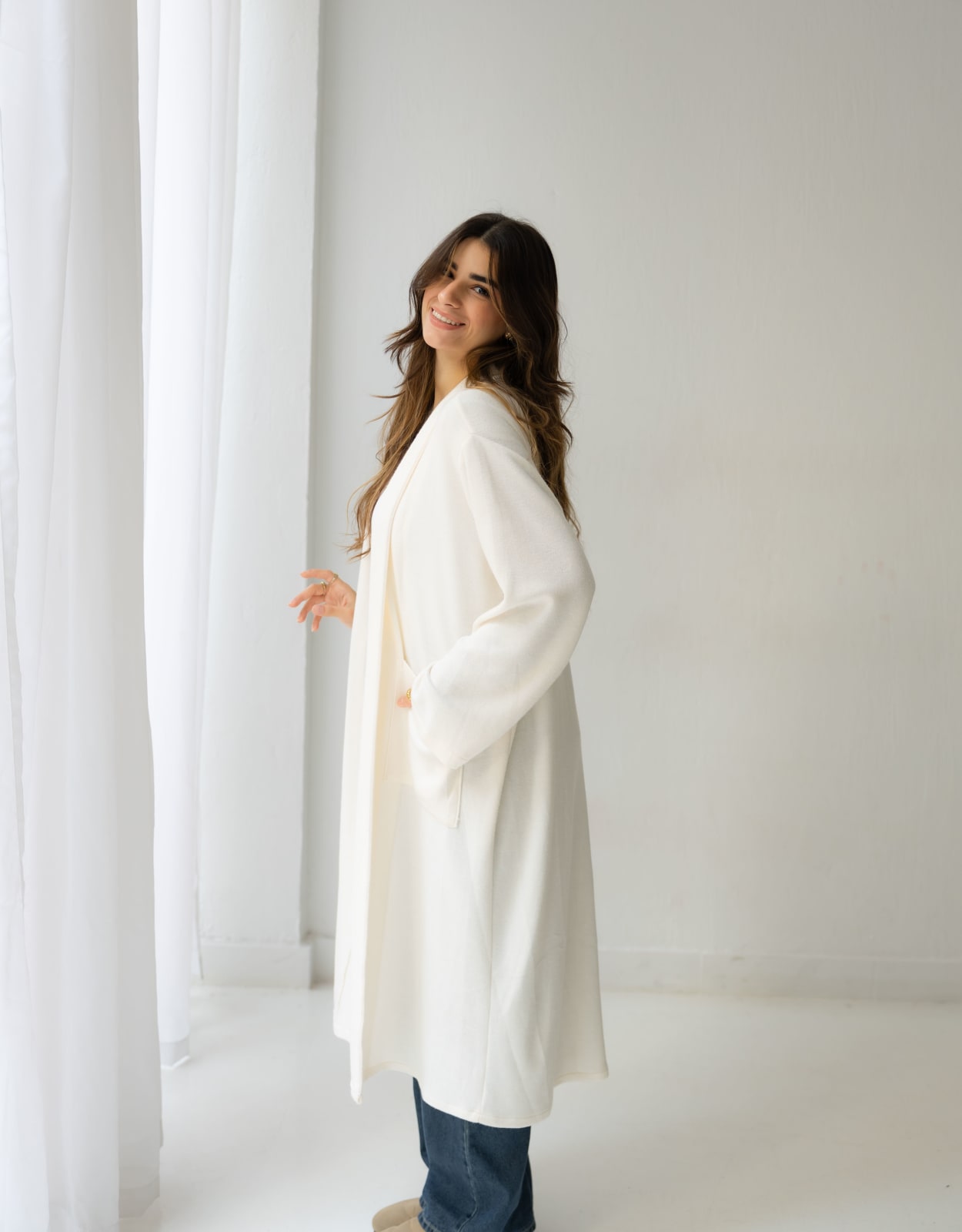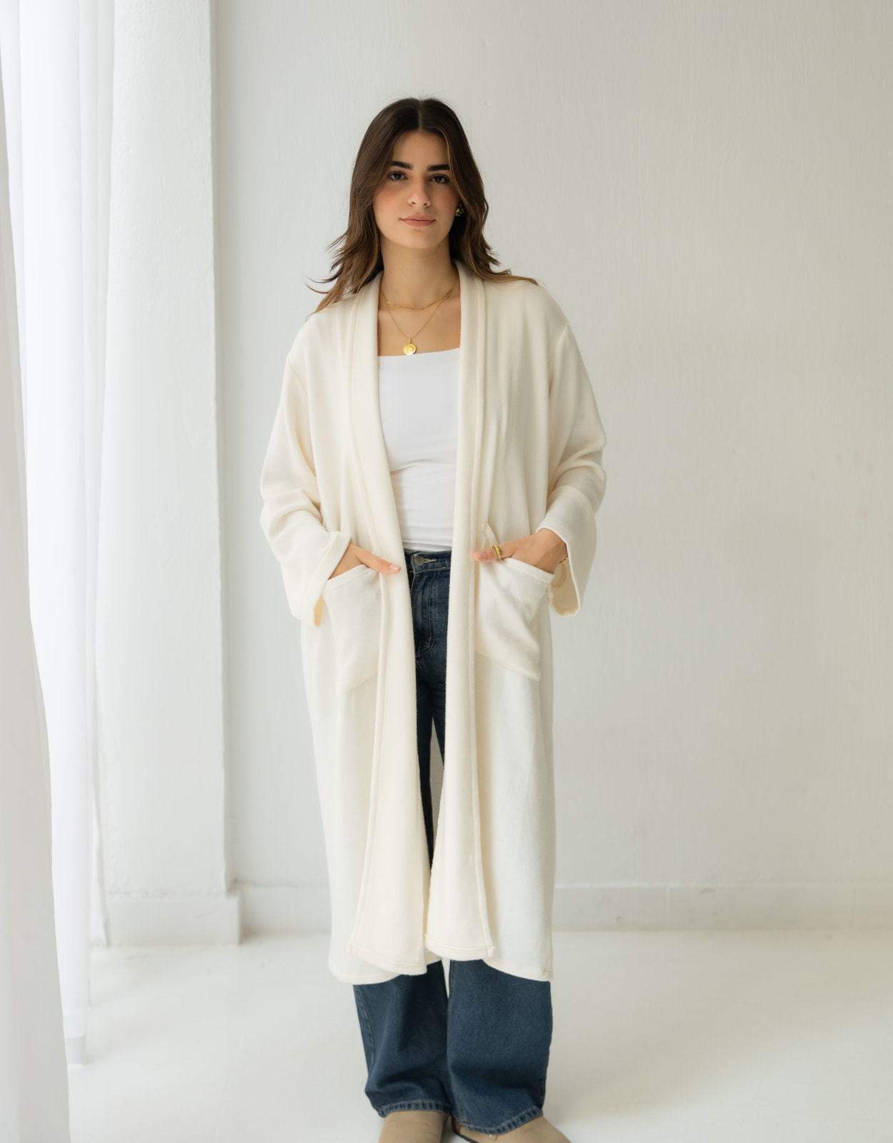A soft cream long knit cardigan designed for effortless layering. Minimal, cozy, and timeless - your go-to piece for any season