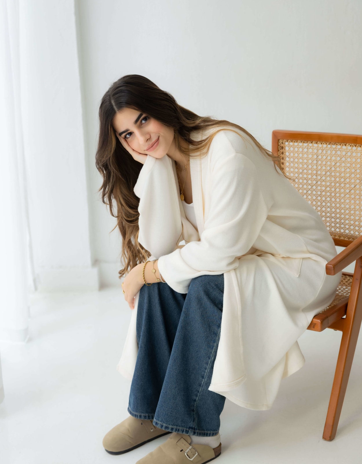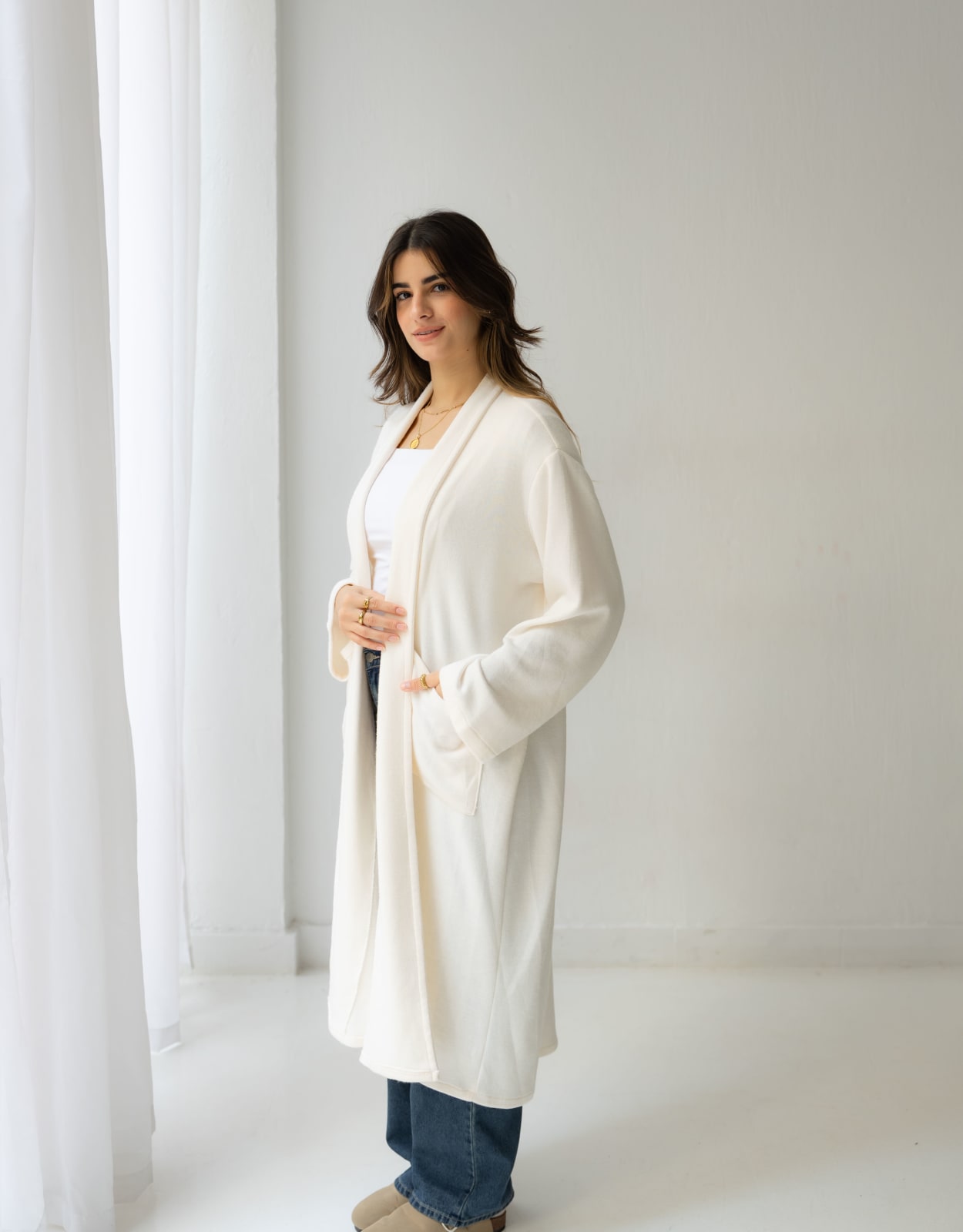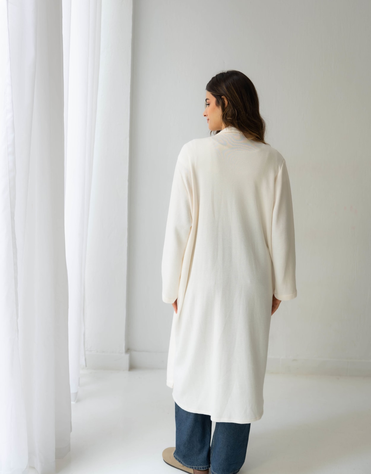 A soft cream long knit cardigan designed for effortless layering. Minimal, cozy, and timeless - your go-to piece for any season